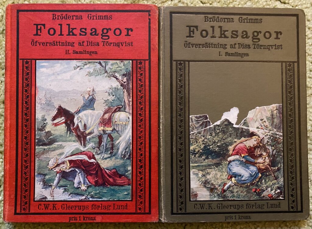 Få böcker har utkommit i så många utgåvor som bröderna Grimms europeiska folksagor. Nyss kom jag över två små böcker i översättning från början av 1900-talet. Nu har jag aldrig läst Grimm på tyska och visst kan gamla sagor ibland vara ganska grovhuggna i struktur och språk men här undrar jag om inte översättaren Disa Törnqvist gått lite väl hårt fram med språksekatören.