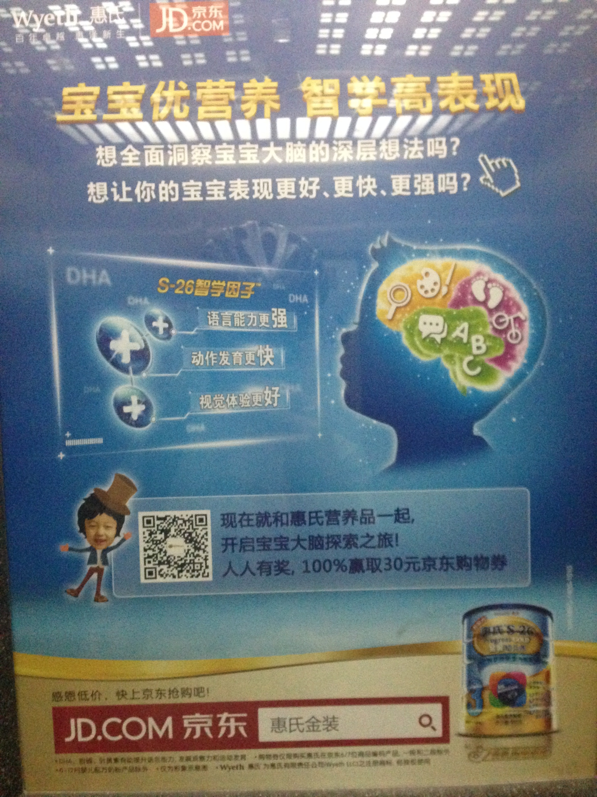 En annan produkt som det ofta är reklam för på TV eller i hissen är babyformel. Det där pulvret som man kan köpa i stora metallburkar och ska fungera som prestationshöjare för bebban, lite som barnvänliga steroider. Nå, det sista kanske inte var sant, men det är så dem marknadsförs i Kina. Reklamen på bilden utlovar att din bebis blir starkare, smartare och får bättre syn (alltså inte blir närsynt).
